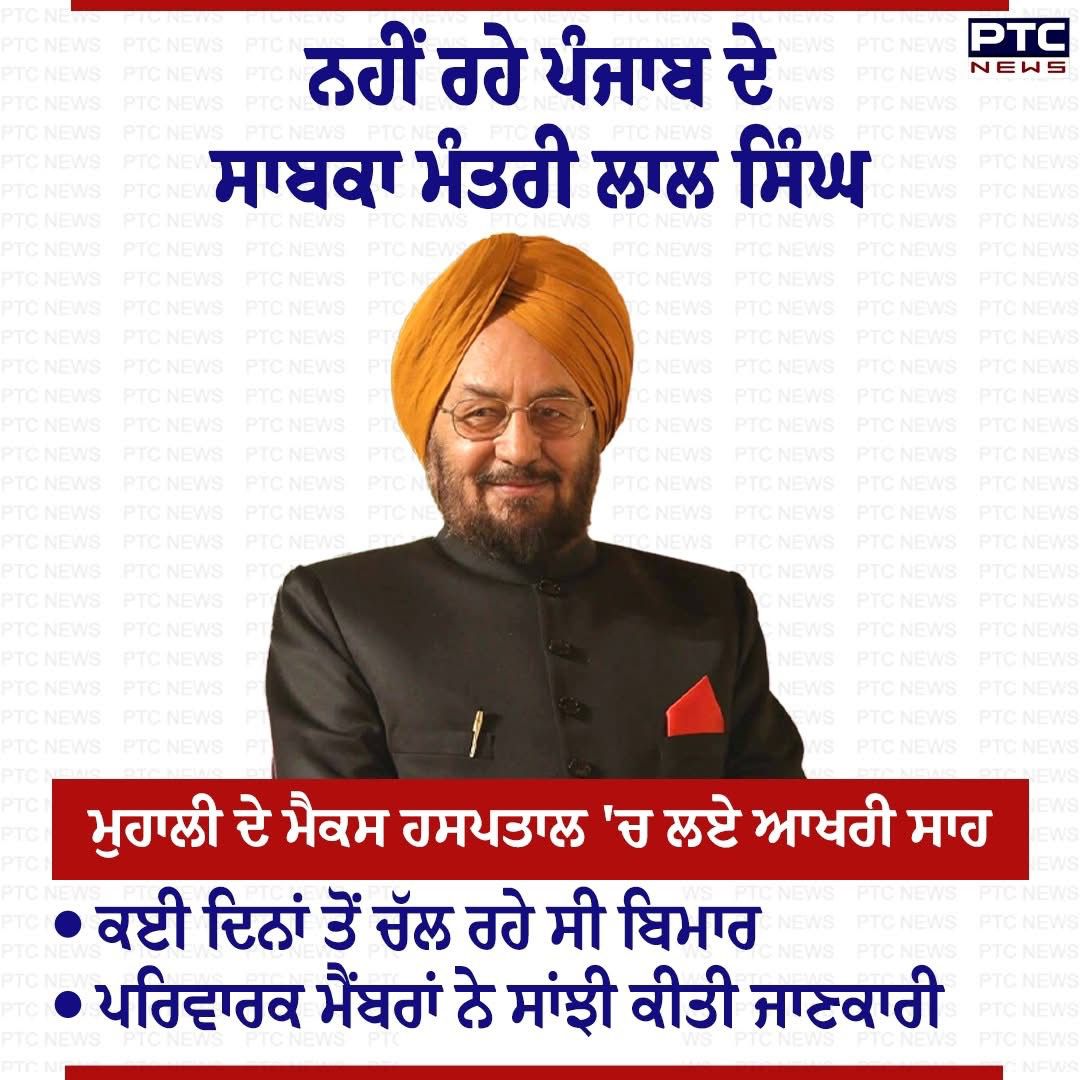 (पटियाला, 28 मार्च – जसविंदर जुल्का न्यूज़ रूम ब्यूरो) पंजाब कांग्रेस की राजनीति के भीष्म पितामह, कई बार विधायक और कई बार मंत्री रहे वरिष्ठ नेता लाल सिंह का आज मोहाली के मैक्स अस्पताल में बीमारी के बाद निधन हो गया। इस बात की पुष्टि उनके पुत्र और समाना से पूर्व विधायक काका राजिंदर सिंह ने की।
